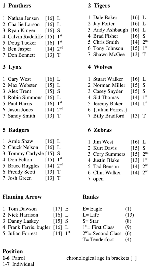 Charlie Dawson: Tom’s oldest brother, by nearly six years. He was Tom’s hero and role model. He was Troop Nine’s Junior Assistant Scoutmaster when Tom was in Cub Scouts. Charlie is gay, an MBA, and lives in Boston with his lover, whom Tom met once. That relationship is a major influence on Tom’s thinking. [12]