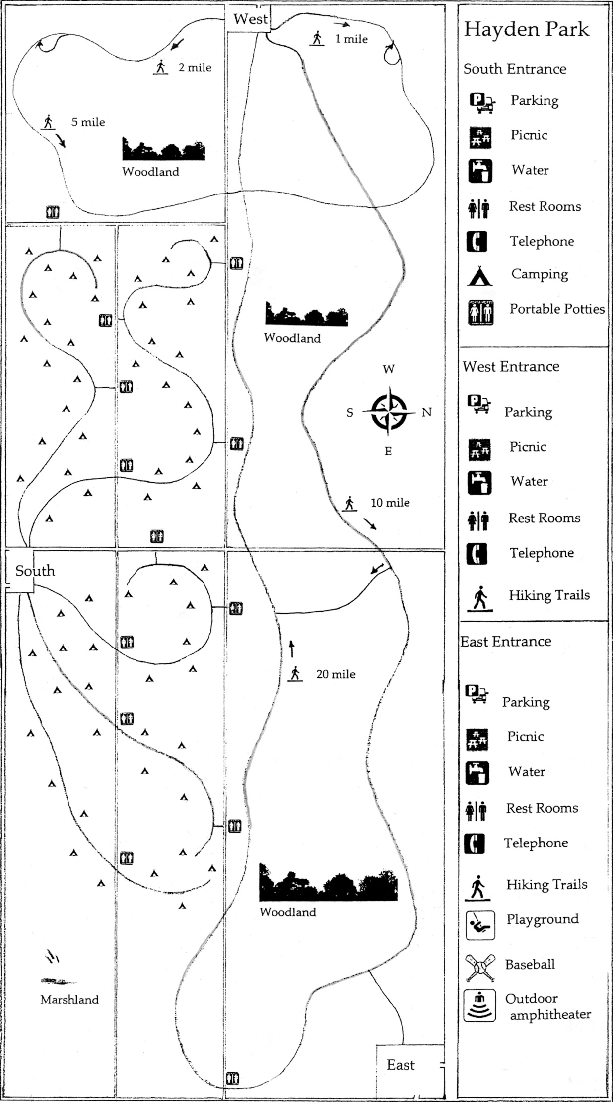 Hayden Park was a combination City/County operation. The vast plot of woodland, five miles long and two miles wide, was honeycombed with trails; daytime picnic and recreation areas could handle large groups; 60 overnight camping sites were accessible by trail. These were arranged and spaced to assure privacy, but not isolation. Campfires were allowed in season, but campers were expected to provide their own fuel and use the designated campfire rings. A few single lane safety roads made maintenance and fire control possible. These were not open to the public. No motorized vehicles were allowed. It was possible to spend a weekend remote from civilization virtually in the middle of town—the only missing ingredient was a mountain stream. Three parking areas provided running water and restroom facilities, as well trail end drop off points; these allowed people to use the camping areas without having to leave their cars overnight. Attempts to connect the camp areas to city water and sewer had failed twice at the ballot box. Campers had to pack in their water; portable chemical toilets were strategically located along the access roads. There was no staff, no reservations—it was first come first served, year around. No firearms were allowed and hunting was prohibited.